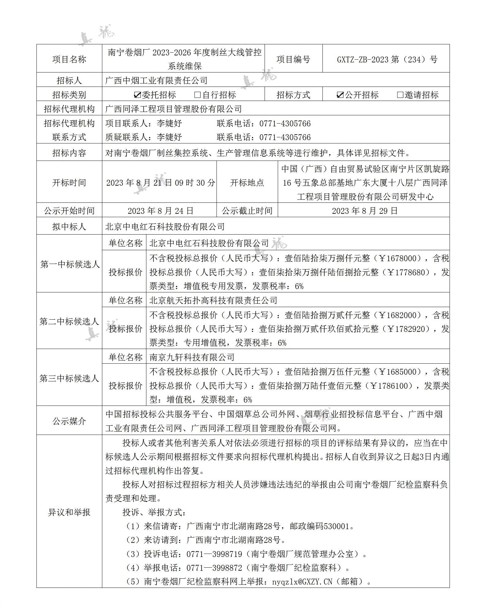 廣西中煙工業(yè)有限責(zé)任公司南寧卷煙廠2023-2026年度制絲大線管控系統(tǒng)維保(項目編號:GXTZ-ZB-2023第(234)號)中標(biāo)候選人公示
