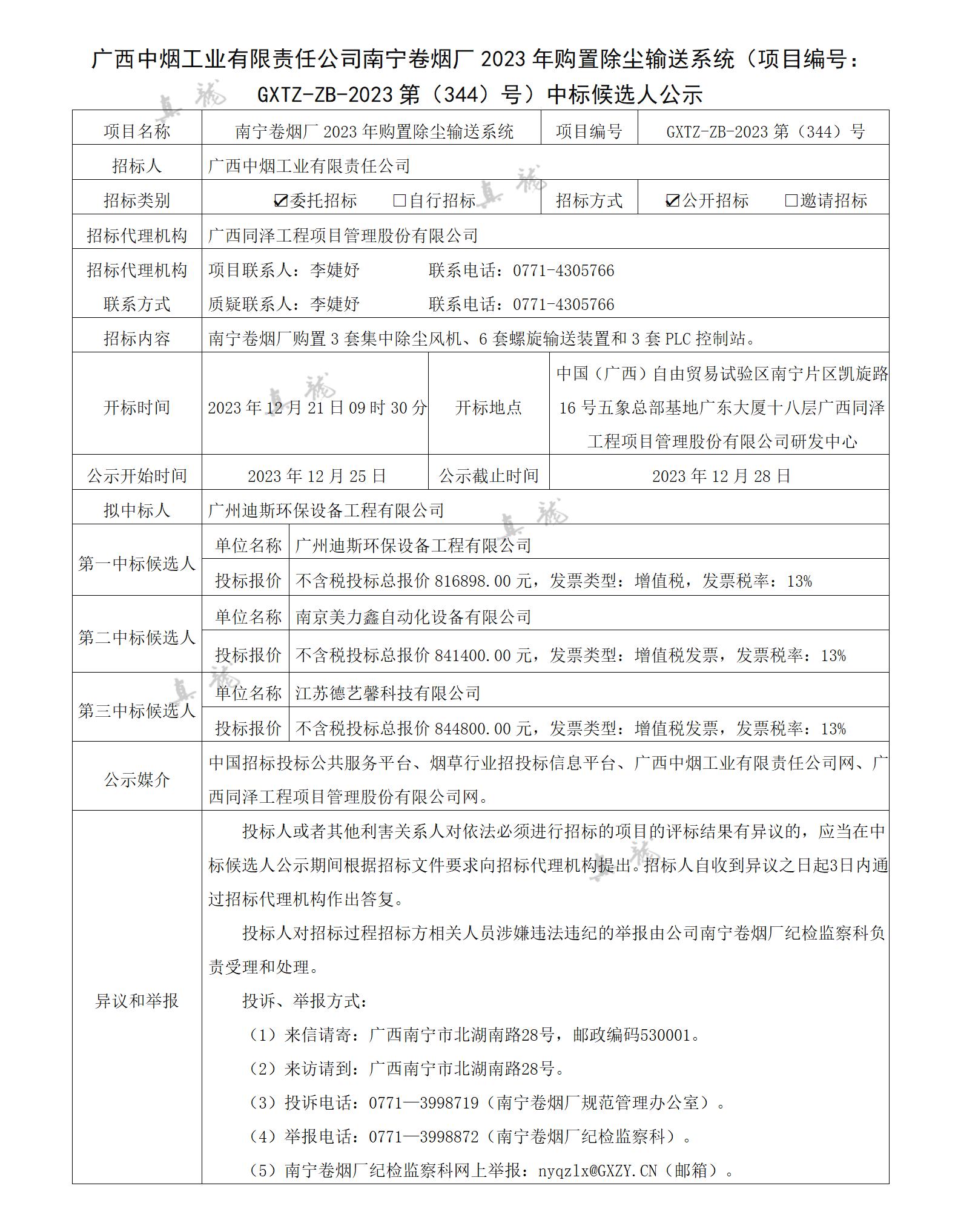 廣西中煙工業有限責任公司南寧卷煙廠2023年購置除塵輸送系統(項目編號:GXTZ-ZB-2023第(344)號)中標候選人公示