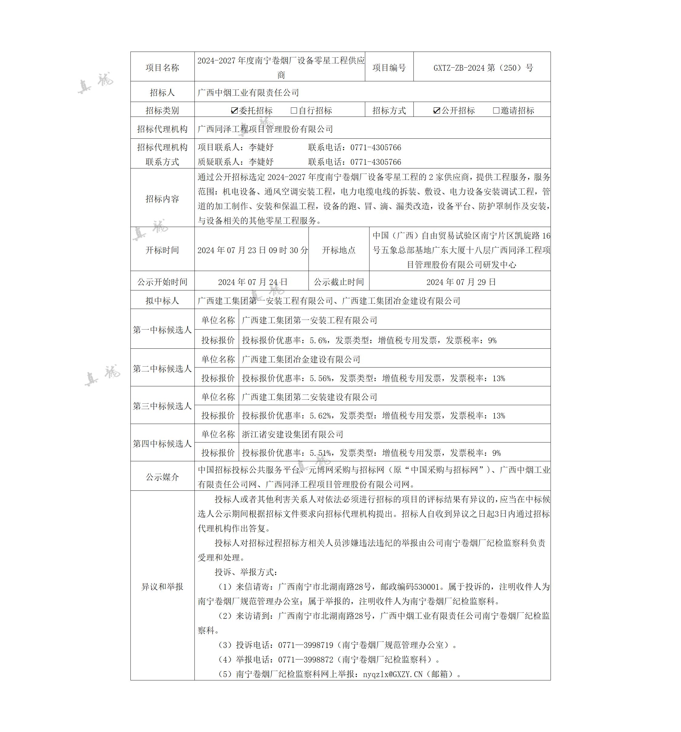 廣西中煙工業有限責任公司2024-2027年度南寧卷煙廠設備零星工程供應商(項目編號:GXTZ-ZB-2024第(250)號)中標候選人公示
